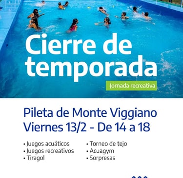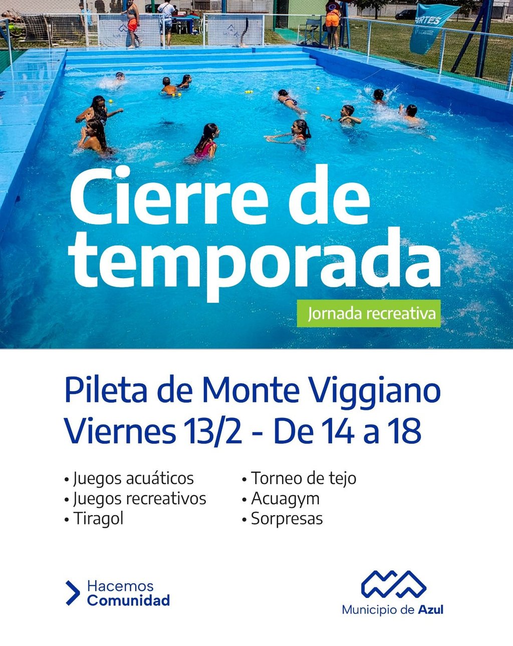 El Municipio de Azul informa que el próximo el viernes 13, de 14 a 18, se realizará el cierre de la temporada de verano en la Pileta Municipal del barrio Monte Viggiano.