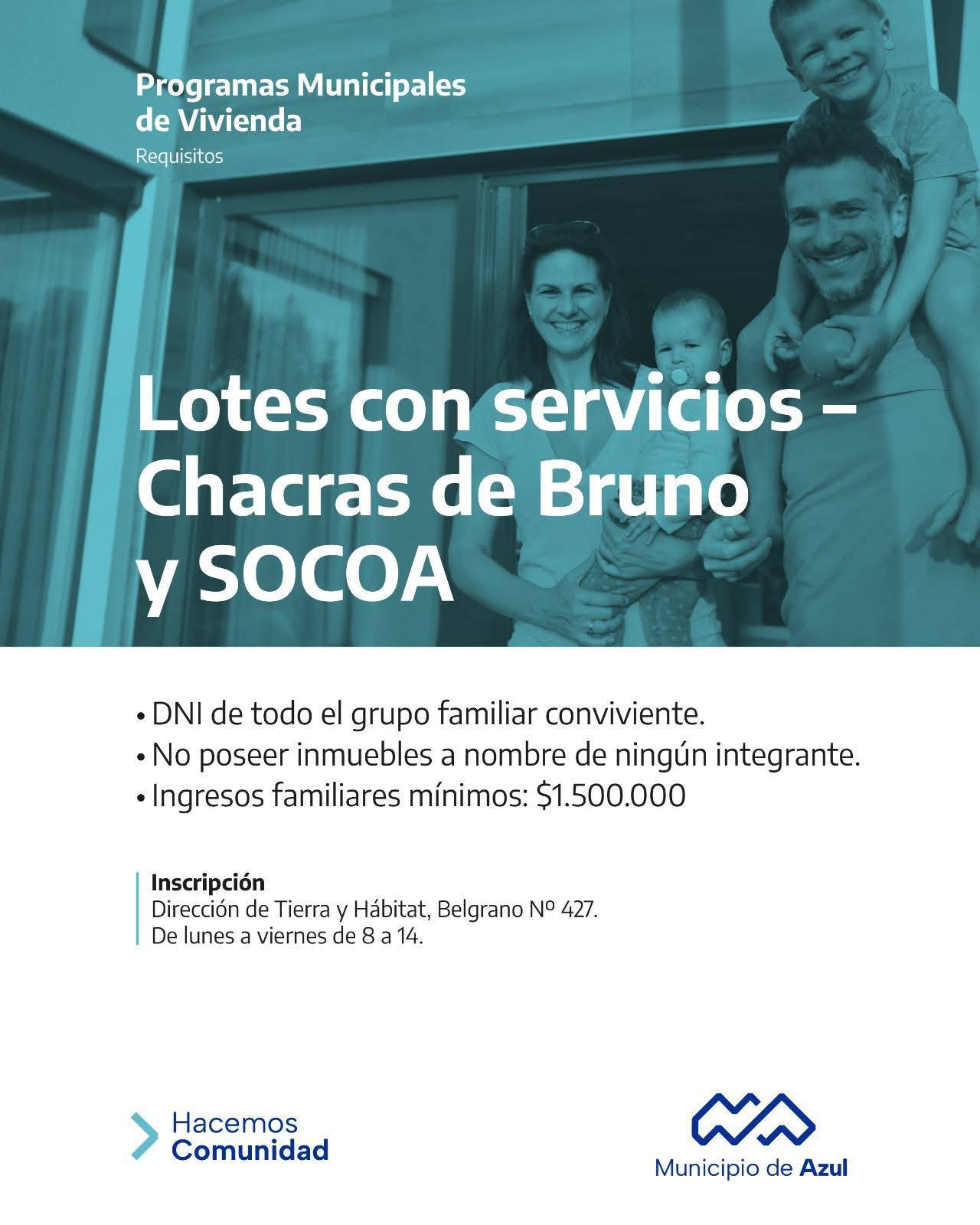 El Municipio de Azul invita a vecinos y vecinas a inscribirse para acceder a lotes con servicios en los barrios Chacras de Bruno y SOCOA y para participar de los programas de mejoramiento habitacional. Las iniciativas se desarrollan en el marco del Registro Único de Demanda Habitacional, como parte de las políticas impulsadas por el intendente Nelson Sombra.