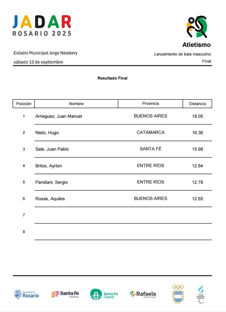 El atleta chillarense se quedó con el primer puesto en la competencia de Lanzamiento de Bala con una marca de 18,05 metros.