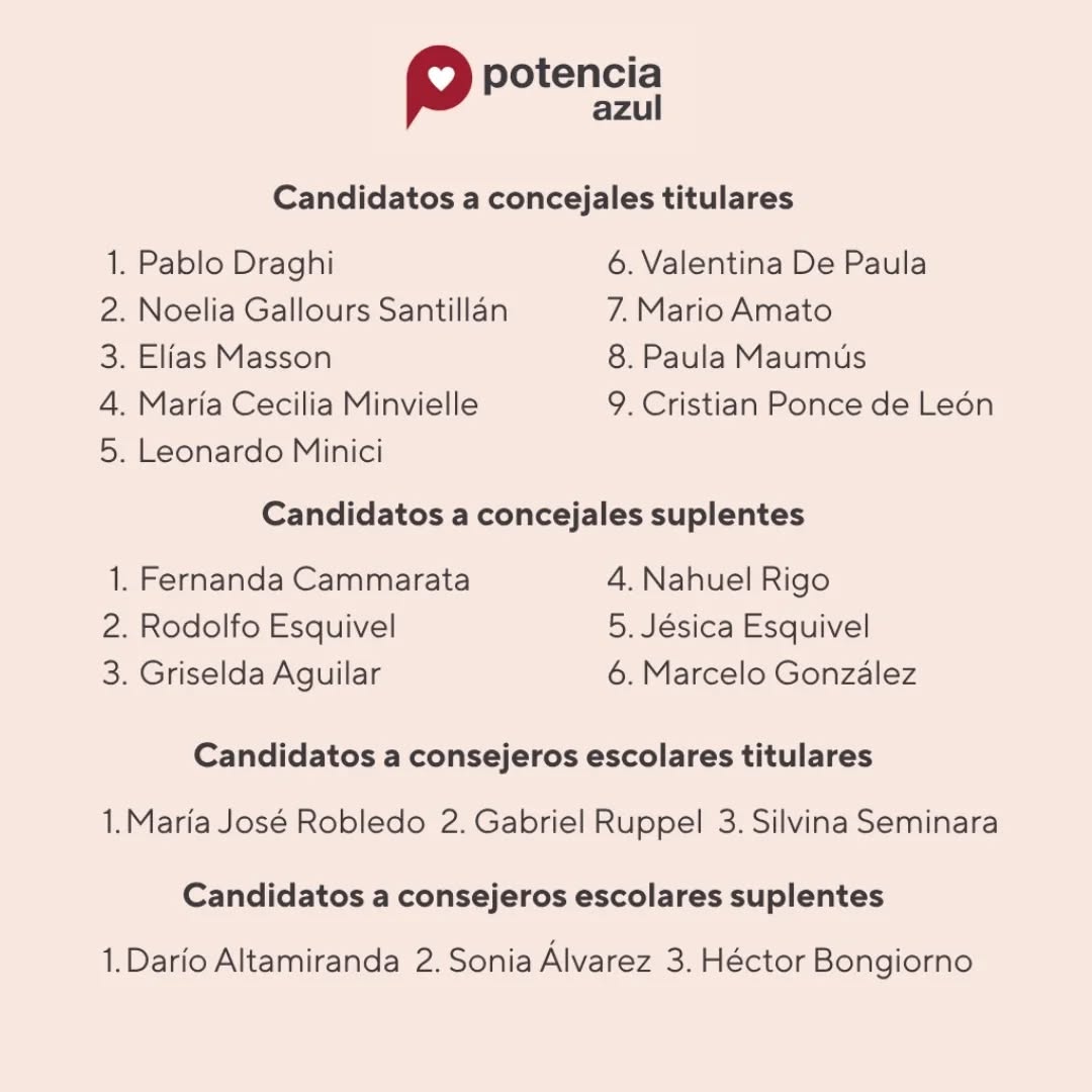El espacio Potencia Azul oficializó su lista de candidatos de cara a las elecciones del próximo 7 de septiembre, con Pablo Draghi encabezando la misma.