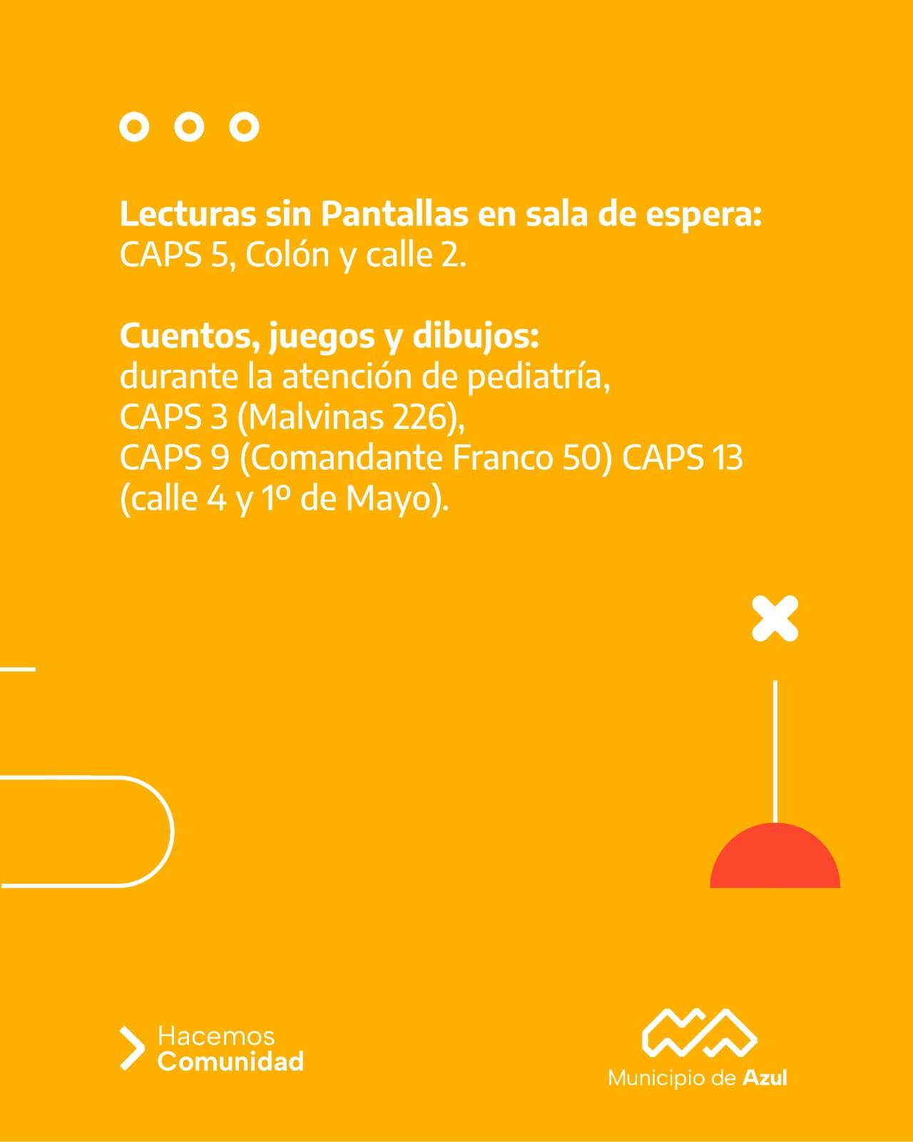 A su vez, el CAPS N°5 (Colón y calle 2) propondrá lectura sin pantallas en su sala de espera; y el N°9 (Comandante Franco 50), un sector de juegos y dibujo.