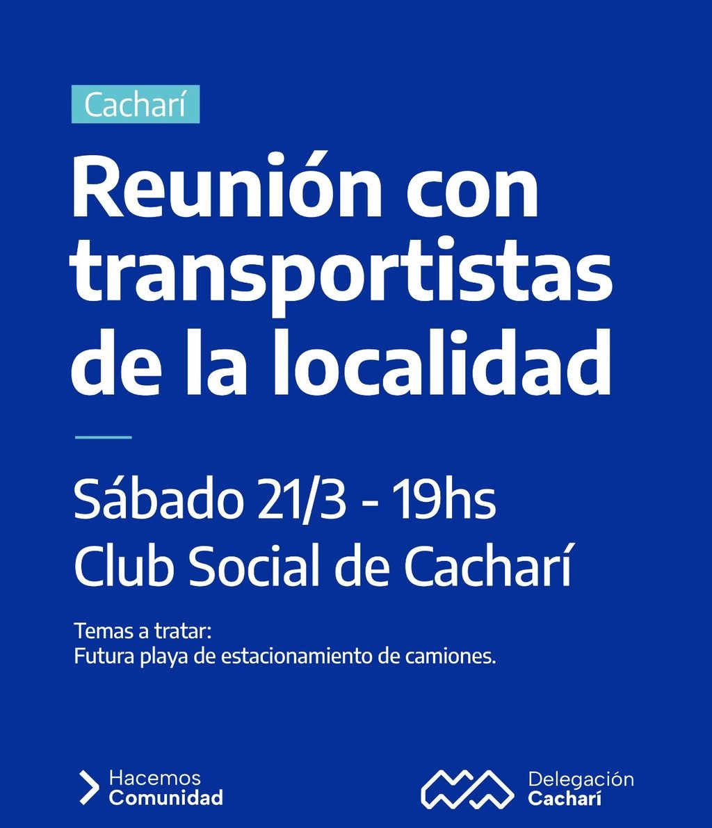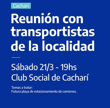 El Municipio de Azul informa que, desde la Delegación de Cacharí, se convoca a los transportistas de la localidad a participar de una reunión informativa.