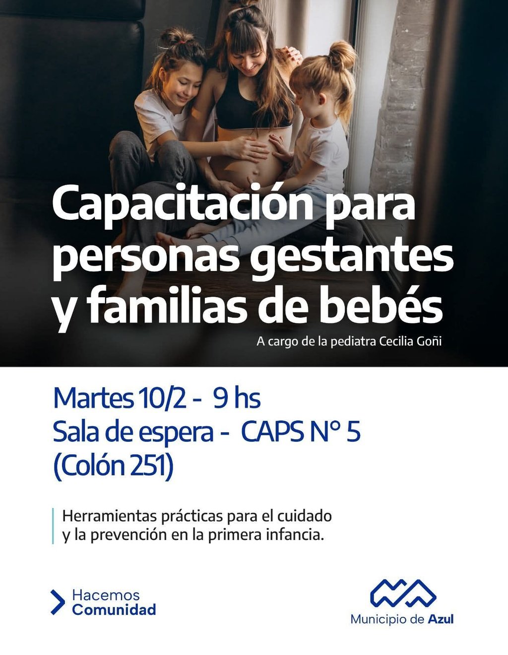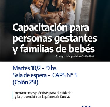 El Municipio de Azul invita a personas gestantes y familias de bebés y/o recién nacidos a participar mañana martes, a partir de las 9, de una capacitación sobre primeros cuidados que se desarrollará en el en el CAPS N°5 -Colón 251-.