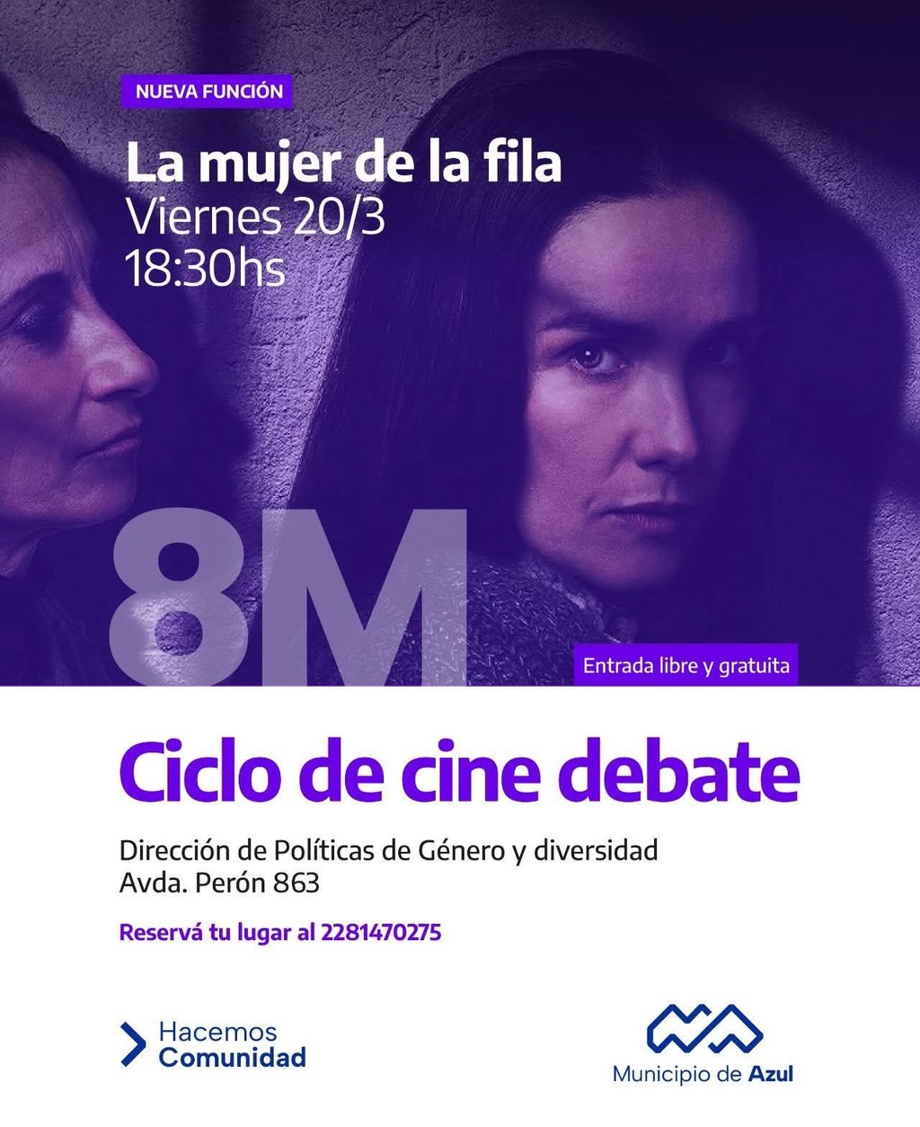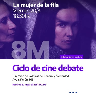 En el marco del ciclo de cine debate impulsado por la Dirección de Género y Diversidades, con motivo de la conmemoración del Día Internacional de la Mujer, el Municipio de Azul informa que este viernes 20 se proyectará “La mujer de la fila”.