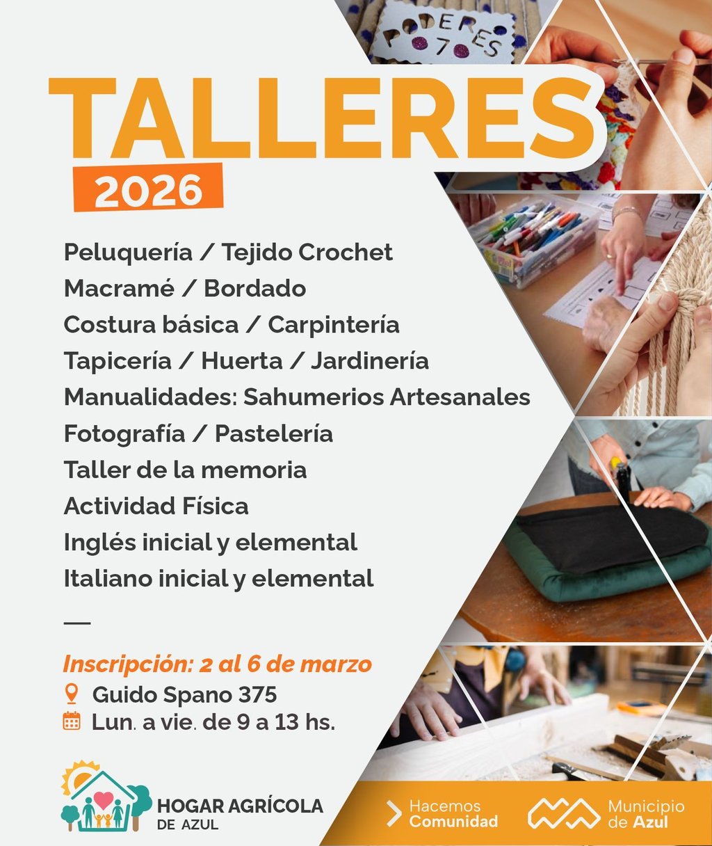 El Municipio de Azul informa que desde el lunes 2 y hasta el viernes 6 de marzo estará abierta la inscripción para los talleres que brindará el Hogar Agrícola en este ciclo lectivo.