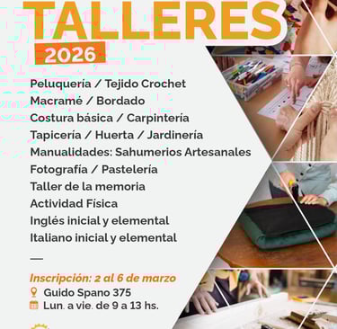 Las propuestas consisten en peluquería, macramé, tejido crochet, bordado, costura básica, carpintería, tapicería, huerta, jardinería, sahumerios artesanales, fotografía, pastelería, taller de la memoria, actividad física, inglés e italiano inicial.