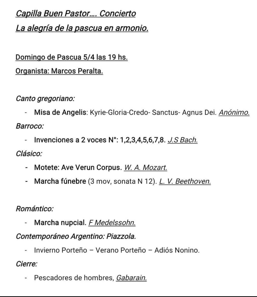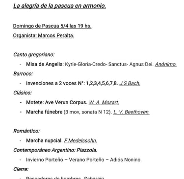 La Capilla de Buen Pastor invita a un concierto de armonio a cargo del organista del Templo: Marcos Peralta, en el día de Pascua.