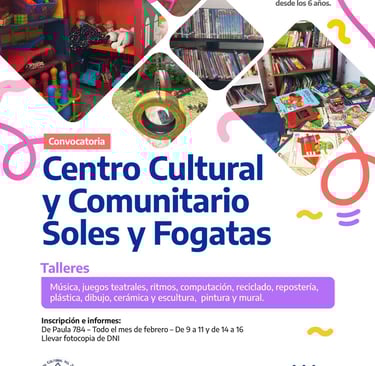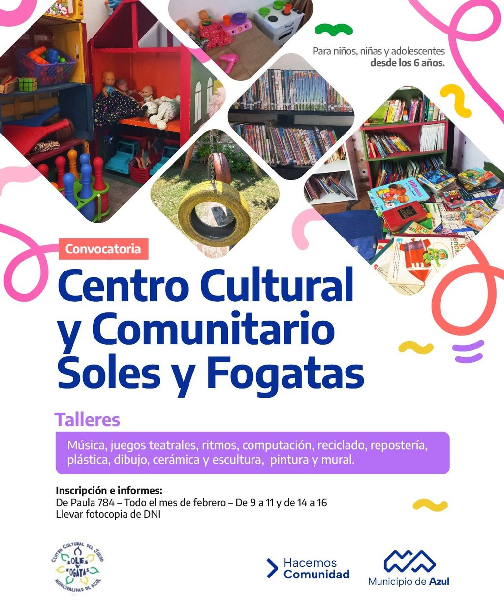 El Municipio de Azul informa que hasta el final de febrero estará abierta la inscripción para participar de los talleres que se brindan en el Centro Cultural y Comunitario Soles y Fogatas de forma gratuita.