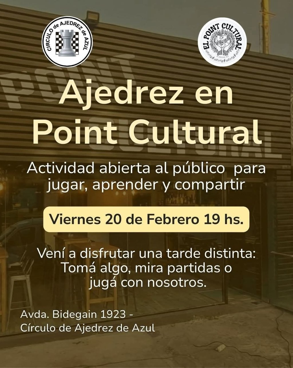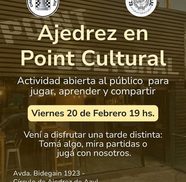El Círculo de Ajedrez de Azul realizará este viernes 20 de Febrero a las 19:00 hs un encuentro abierto al público en el "Point Cultural", (Bidegain 1923).