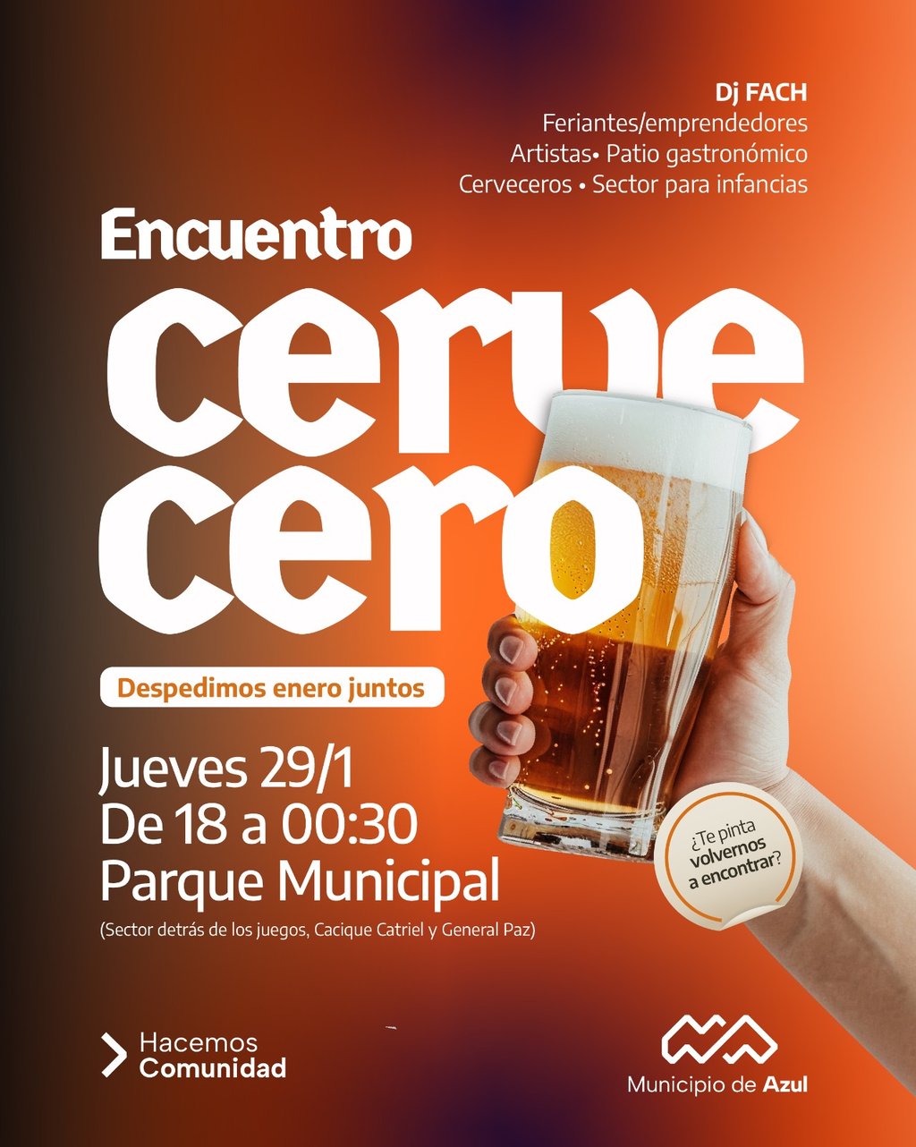 El Municipio de Azul informa que este jueves, de 18 a 00:30 aproximadamente, en el Parque Municipal, se realizará una nueva edición del ciclo de encuentros cerveceros de verano.