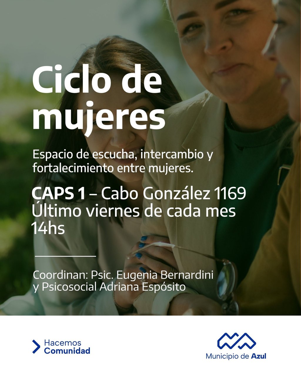El Municipio de Azul informa que, en el marco de los talleres y dispositivos de salud mental que se ofrecen desde Atención Primaria de la Salud, los últimos viernes de cada mes, en el CAPS Nº 1, se ofrece una actividad denominada “Ciclo de mujeres”.