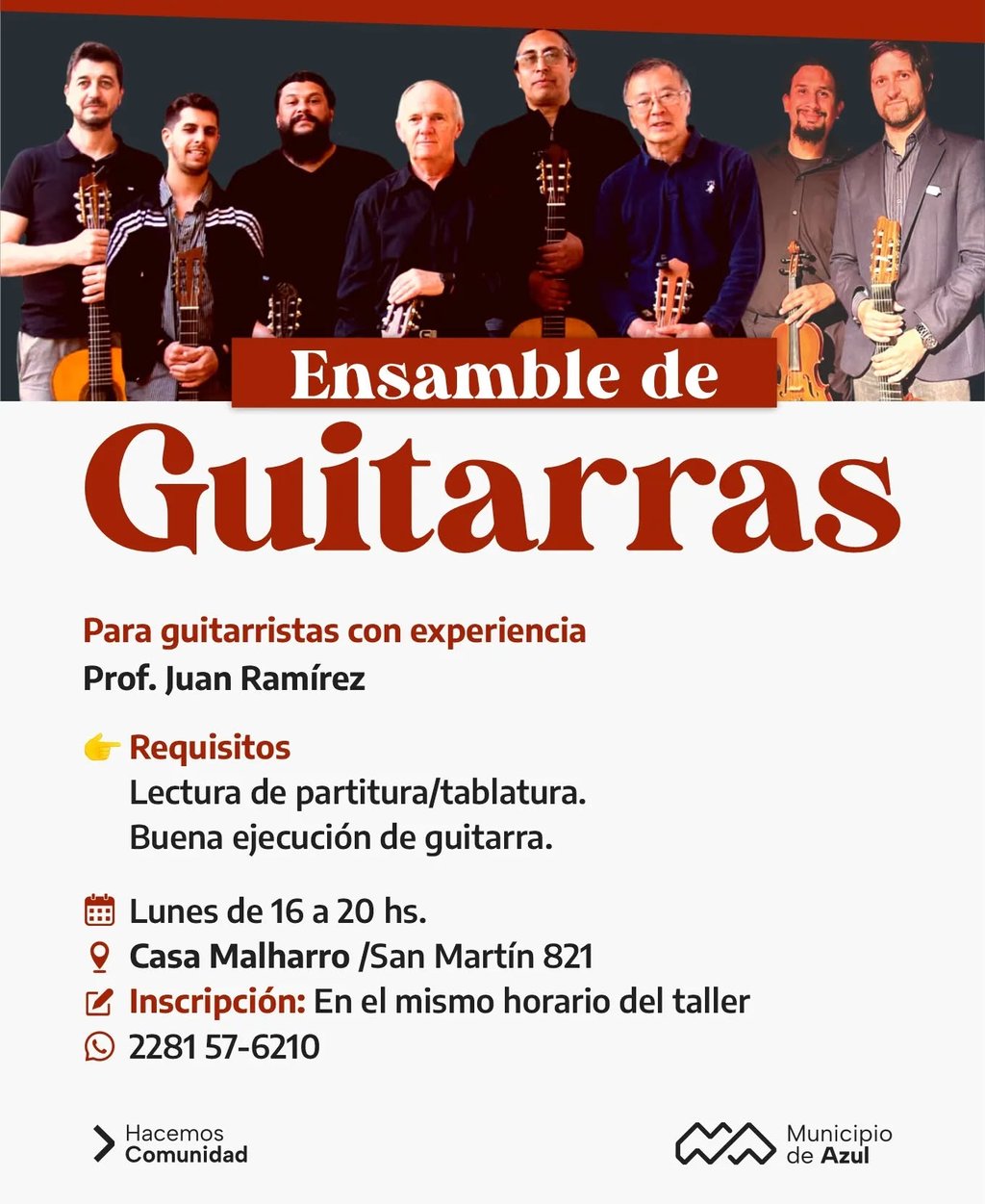 El Municipio de Azul informa que se encuentra abierta la inscripción para el Taller de Guitarra para jóvenes y adultos a cargo del docente Juan Ramírez, que se dictará en Casa Malharro – San Martín 821- los miércoles de 16 a 20.