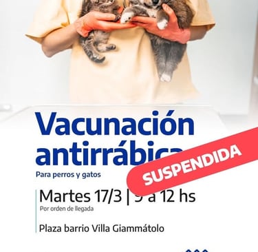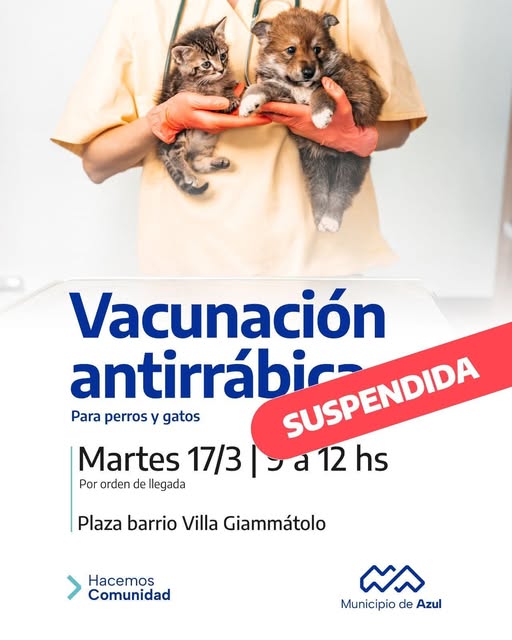 El Municipio de Azul informa que se suspendió -por pronóstico de lluvias- la jornada de vacunación antirrábica que iba a realizarse mañana en el barrio Villa Giammátolo.