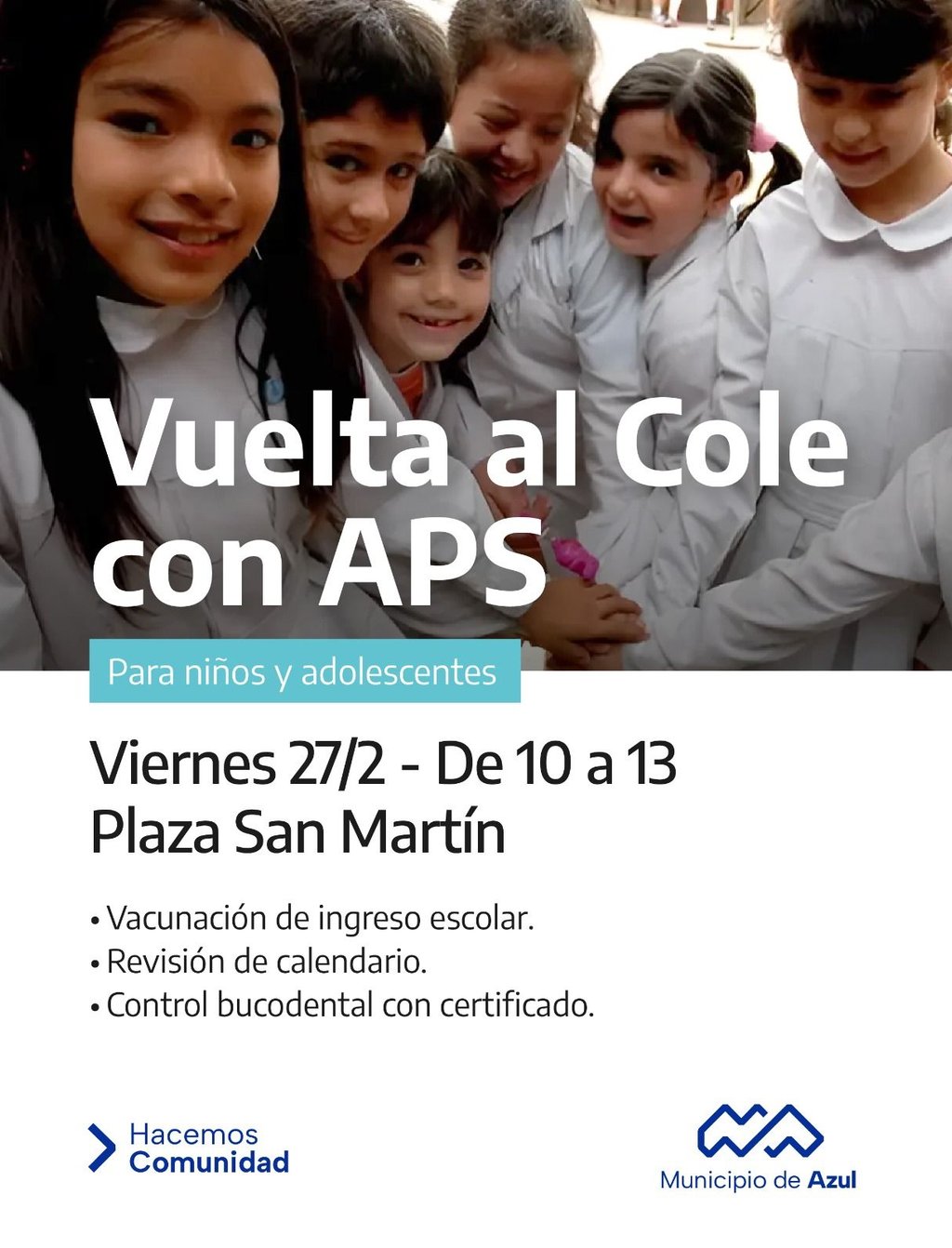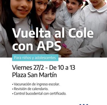 El Municipio de Azul informa que este viernes 27 se llevará adelante una jornada de salud denominada “Vuelta al Cole con APS” destinada a niños, niñas y adolescentes.