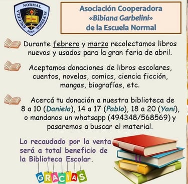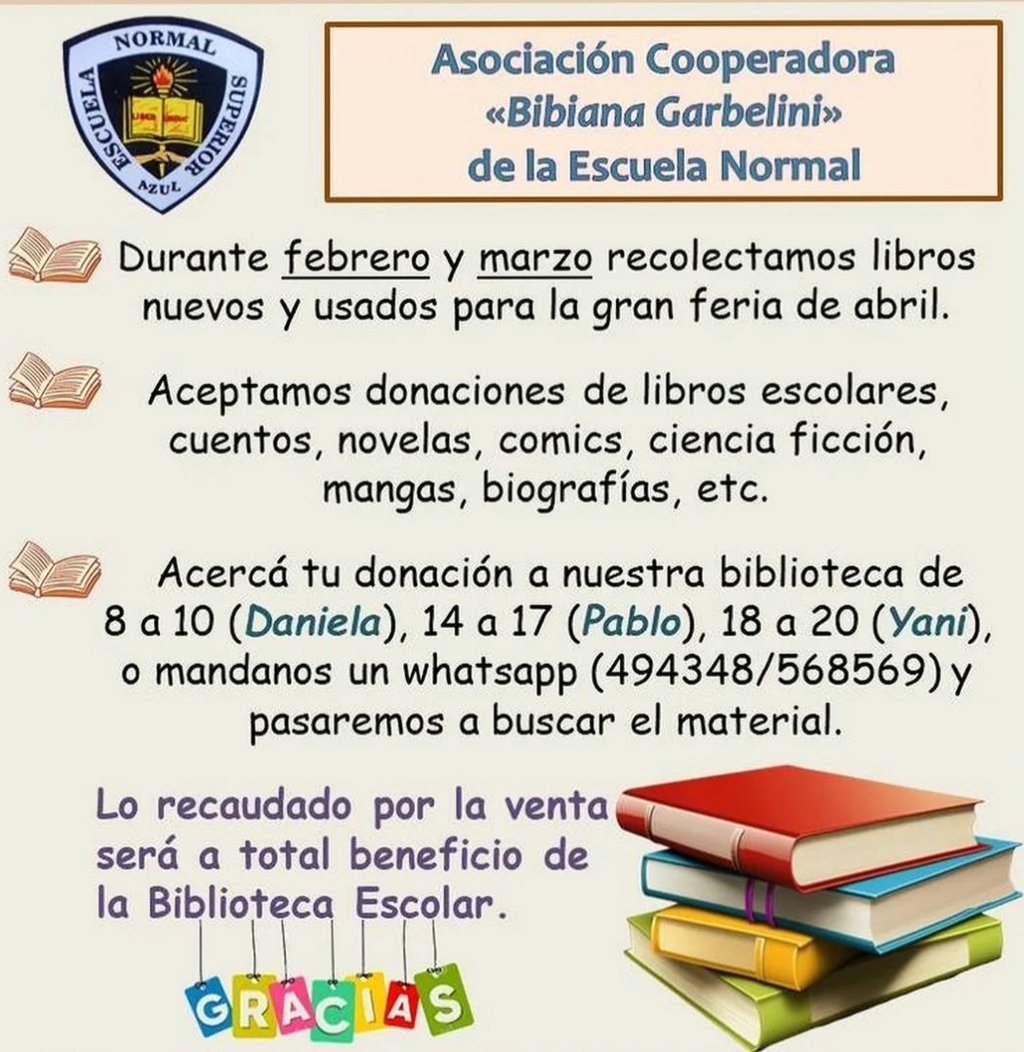La Asociación Cooperadora "Bibiana Garbelini" de la Escuela Normal lleva adelante una campaña de recolección de libros nuevos y usados para la gran feria de abril.