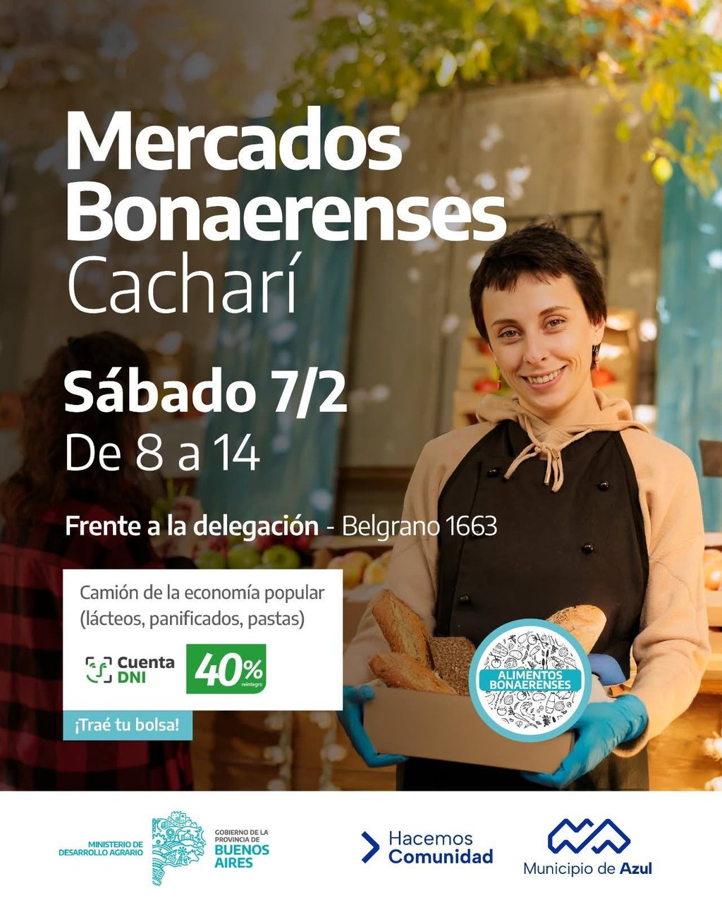 Sábado 7/2, Mercados Bonaerenses estará en Cacharí, frente a la Delegación Municipal. En dicho espacio, de 8 a 14, se ubicará el camión de la economía popular.