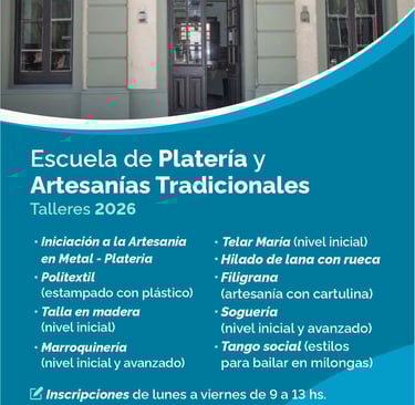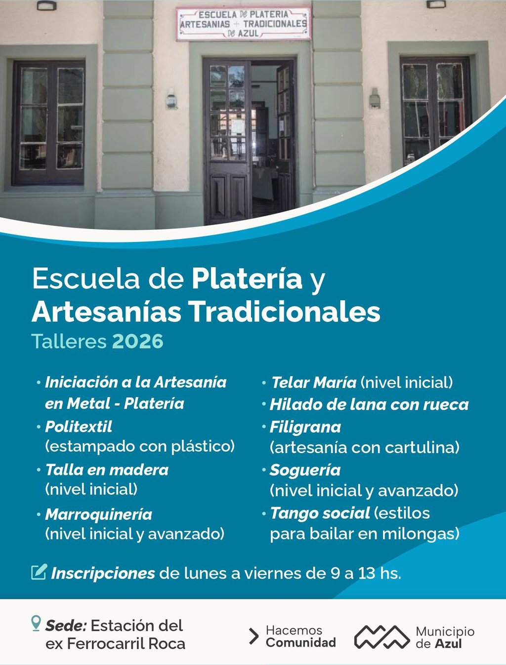 El Municipio de Azul informa que continúa abierta la inscripción para los talleres de la Escuela Municipal de Platería y Artesanías Tradicionales que durante este año serán: Politextil (estampado en plástico); Talla en madera; Marroquinería; Telar María; Hilado de lana con rueca; Filigrana artesanal con cartulina y Tango social.
