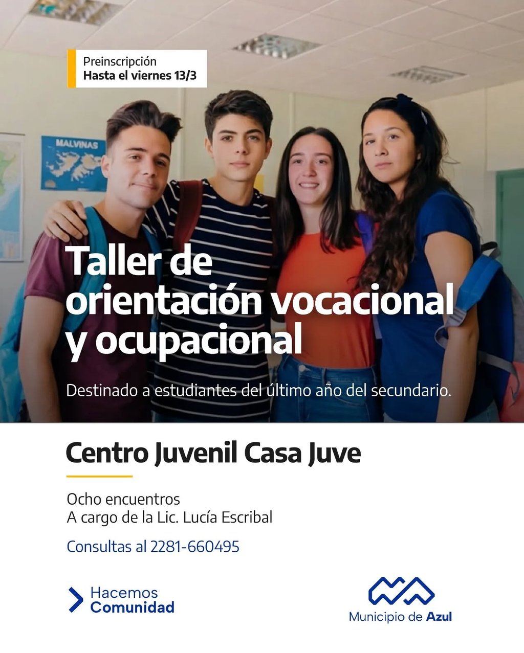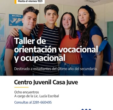 El Municipio de Azul informa que hasta el viernes 13 está abierta la inscripción para el Taller de orientación vocacional y ocupacional que se dicta en el Centro Juvenil “Casa Juve”.