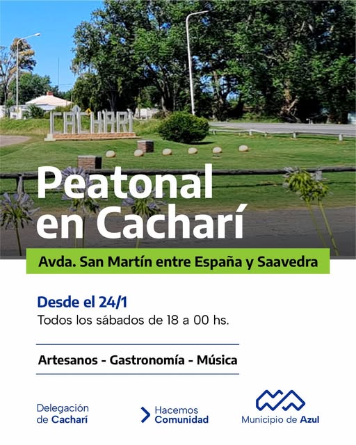El Municipio de Azul informa que, a partir de este sábado 24, se implementará el sector peatonal en el centro de Cacharí todos los sábados, de 18 a 00 horas, aproximadamente.
