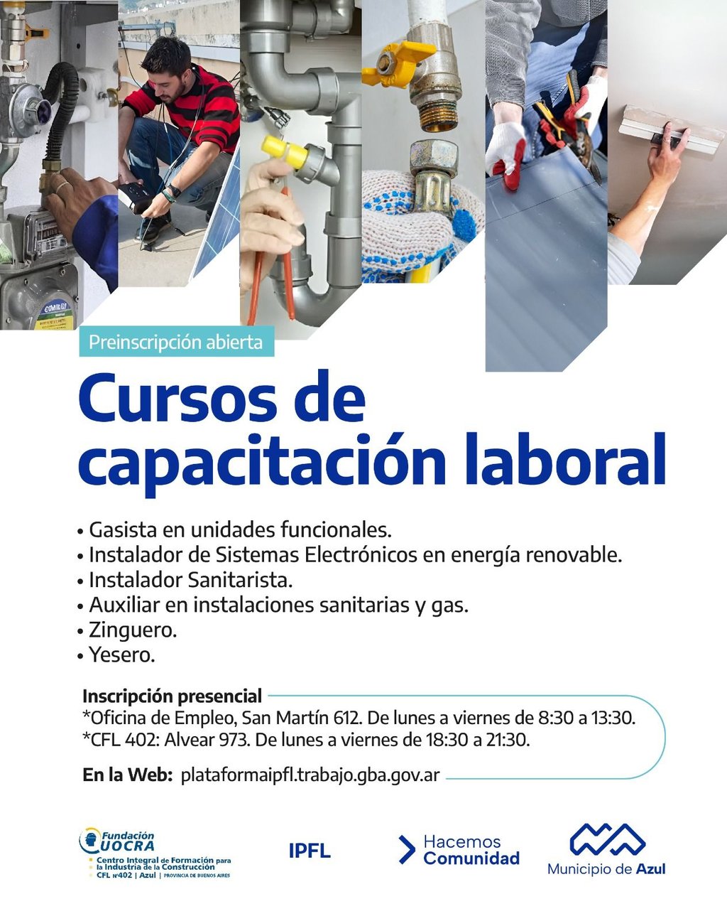 El Municipio de Azul informa que se encuentra abierta la preinscripción para diferentes cursos de capacitación laboral.