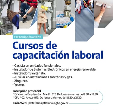 Al respecto, desde el área municipal de Empleo y Capacitación, el Centro de Formación Laboral N° 402 y el IPFL (Instituto Provincial de Formación Laboral) se detalla que se trata de Gasista en unidades funcionales, Instalador de Sistemas Electrónicos en energía renovable, Instalador sanitarista, Auxiliar en instalaciones sanitarias y gas, Zinguero y Yesero.