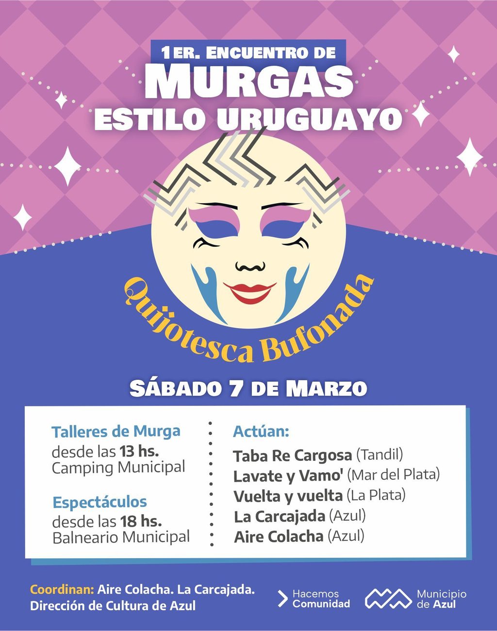 Para continuar, a partir de las 18, en el Balneario Municipal, actuarán Taba Re Cargosa (Tandil), Lavate y Vamo' (Mar del Plata), Vuelta y vuelta (La Plata), La Carcajada (Azul) y Aire Colacha (Azul).