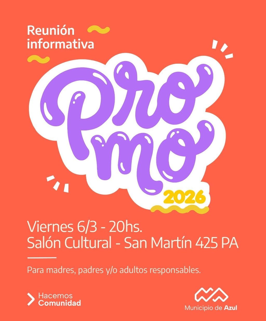 El Municipio de Azul convoca a madres, padres y adultos responsables de estudiantes secundarios que conforman la Promo 2026 a la reunión que se hará el viernes 6 de marzo, a las 20.