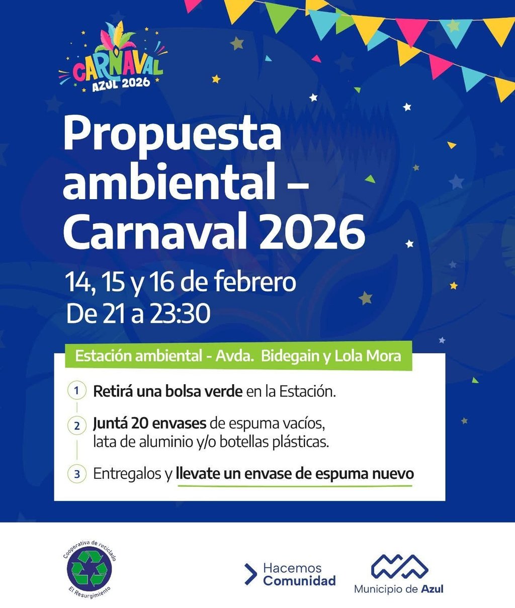El Municipio de Azul invita a la comunidad a participar de la propuesta ambiental que se impulsará en el marco del Carnaval Azul 2026, el cual se desarrollará este sábado 14, domingo 15 y lunes 16 en el Balneario Municipal.