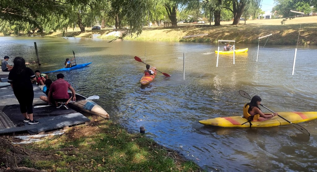 Esta mañana jóvenes que integran el programa provincial Envión, dependiente de la Dirección de Políticas Juveniles de la comuna, participaron de clases de canotaje que forman parte del cronograma de actividades de verano en el Balneario Municipal.