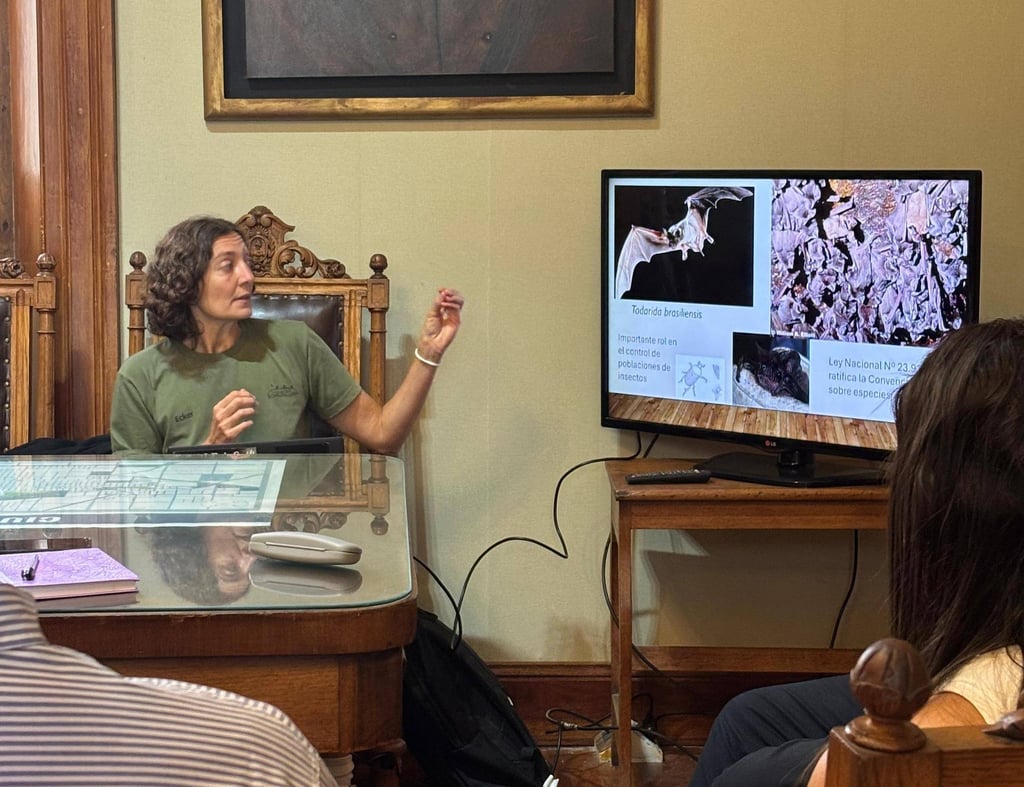 Durante esta jornada, el intendente Nelson Sombra -junto al secretario de Gobierno Xavier Cabrera Cisneros– mantuvo una reunión con funcionarios, miembros de la Comisión local de Control de Plagas y Ayelén Lutz, integrante del Programa de Conservación de Murciélagos de Argentina, con el objetivo de abordar el protocolo de exclusión de murciélagos avalado por la Red Latinoamericana y del Caribe en el tema y analizar su aplicación en el edificio del ex Club Social.