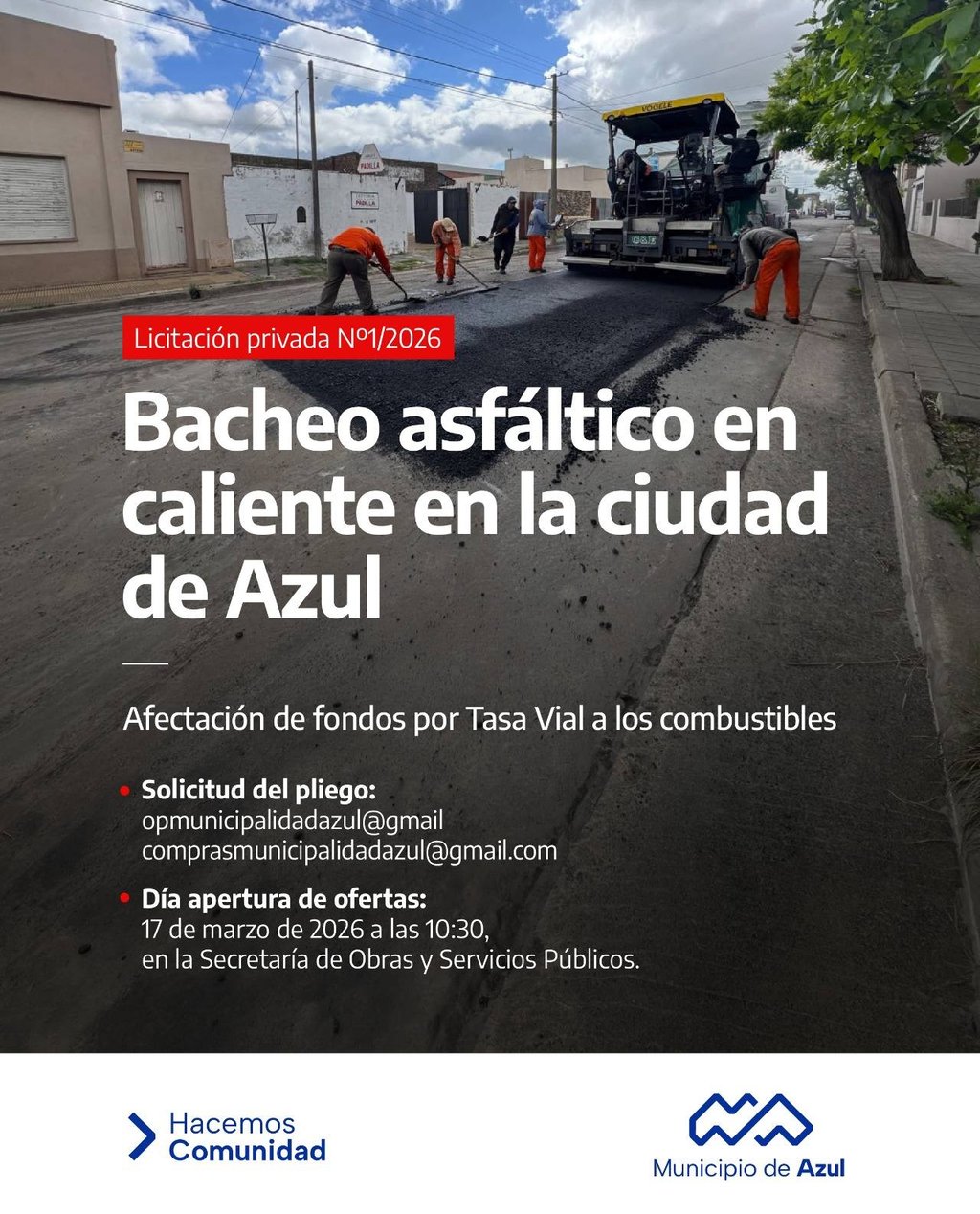 El Municipio de Azul informa que se encuentra abierta la licitación pública número 3 destinada al bacheo de hormigón en la ciudad de Azul. Asimismo, se abrió la convocatoria a proveedores –a través de la licitación privada número 1- para el bacheo asfáltico en caliente en la localidad. Ambas obras corresponden a la afectación de fondos por la Tasa Vial a los combustibles en el período 2026.