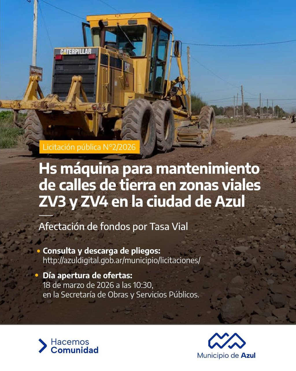 El Municipio de Azul informa que se encuentran abiertas las licitaciones públicas N° 1 y N° 2 destinadas a la contratación de horas máquina para el mantenimiento de calles de tierra en Azul.