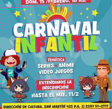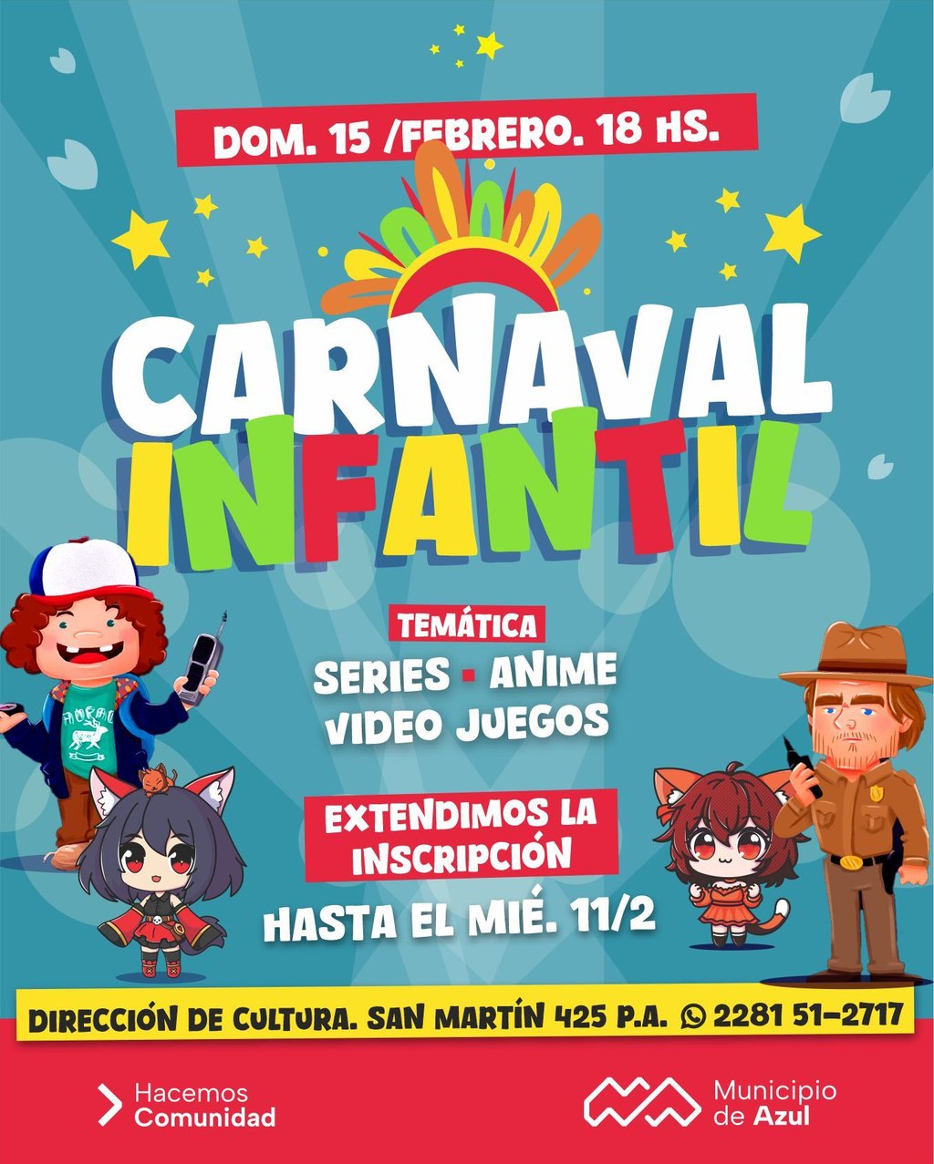 El Municipio de Azul informa que se extiende hasta el próximo miércoles 11 de febrero la convocatoria para participar del Carnaval Infantil cuya temática será series, animé y videojuegos.