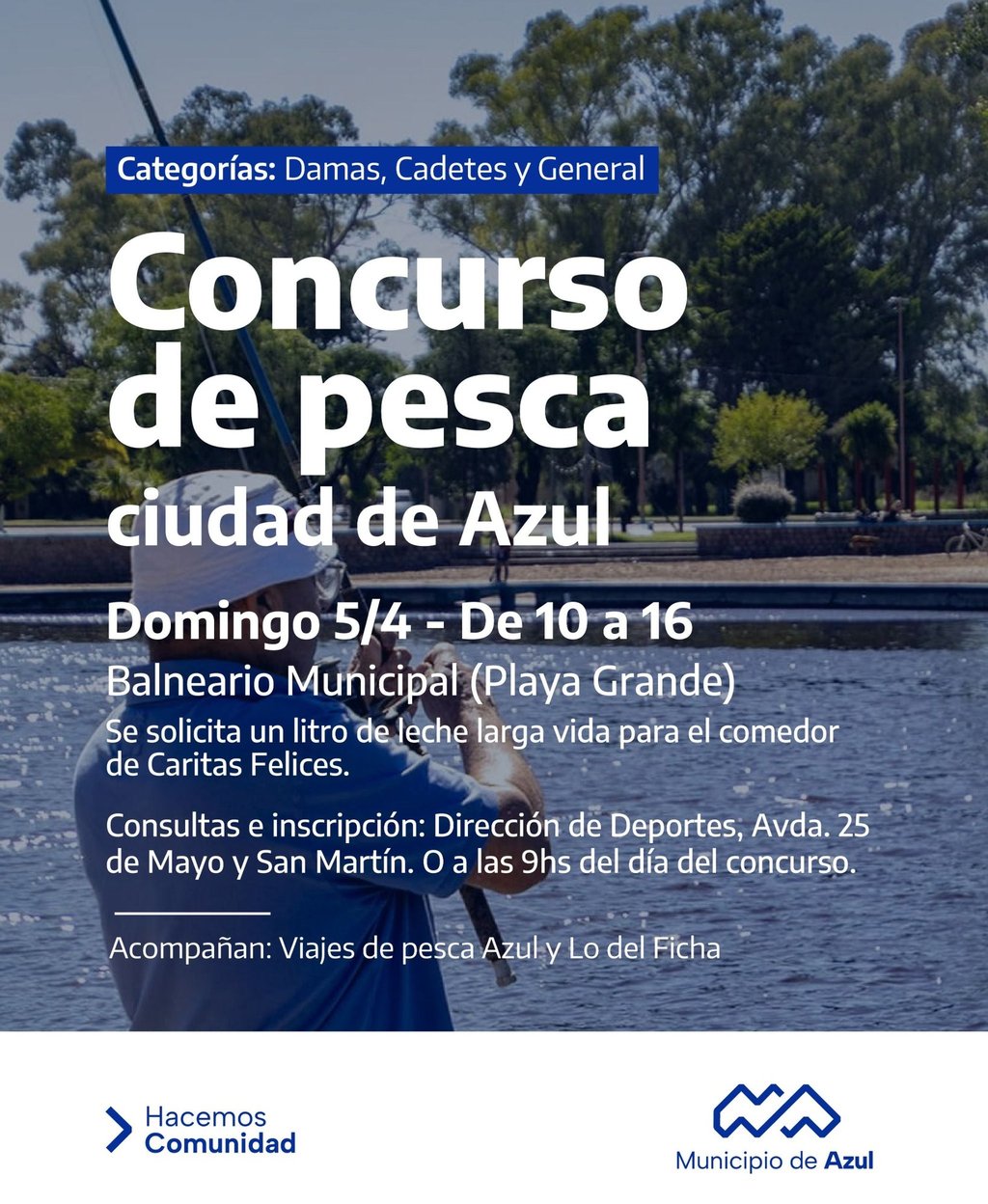 El Municipio de Azul informa que el domingo 5, en el sector de Playa Grande del Balneario Municipal, se desarrollará el concurso de pesca “Ciudad de Azul”.