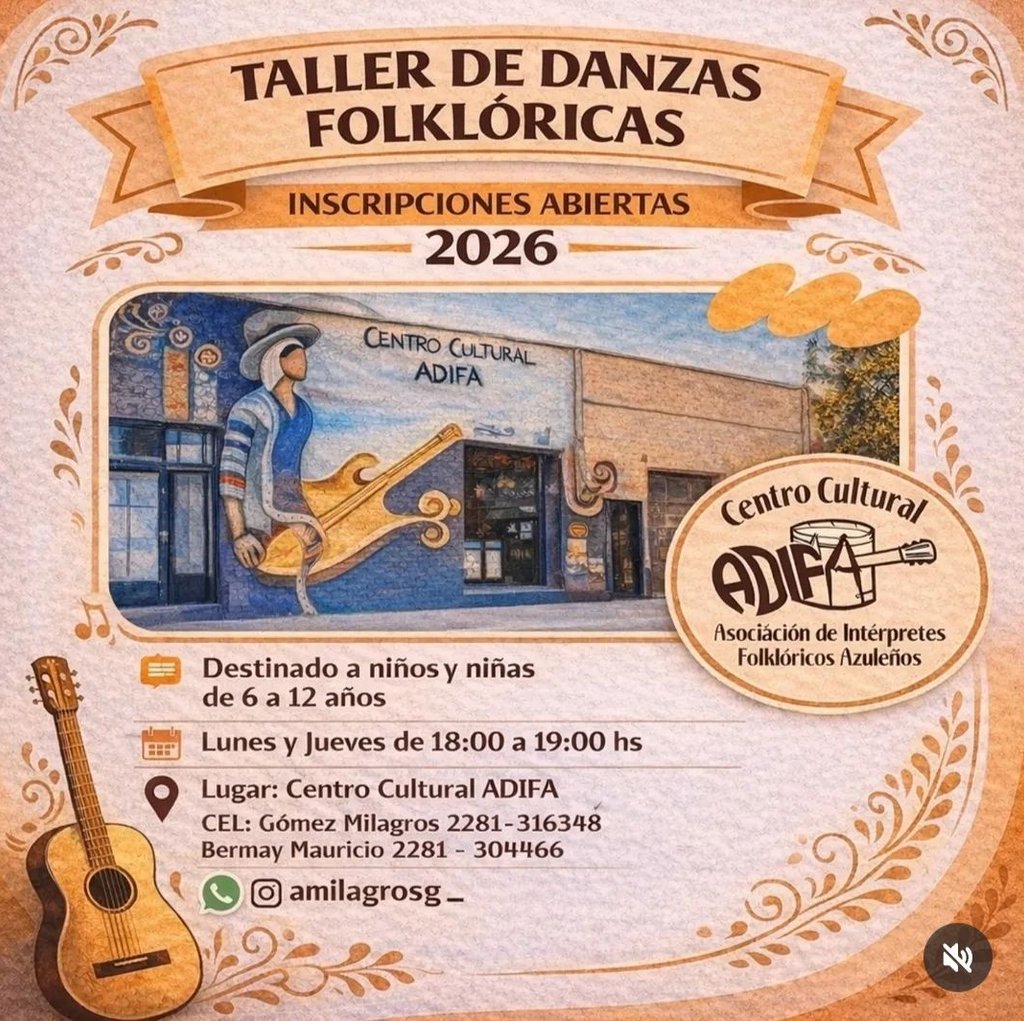 Se encuentra abierta la inscripción para el Taller de Danzas Folclóricas 2026, que se llevará a cabo en el Centro Cultural ADIFA (Av. 25 de Mayo 1036), los dúas l unes y jueves de 18 a 19 hs.