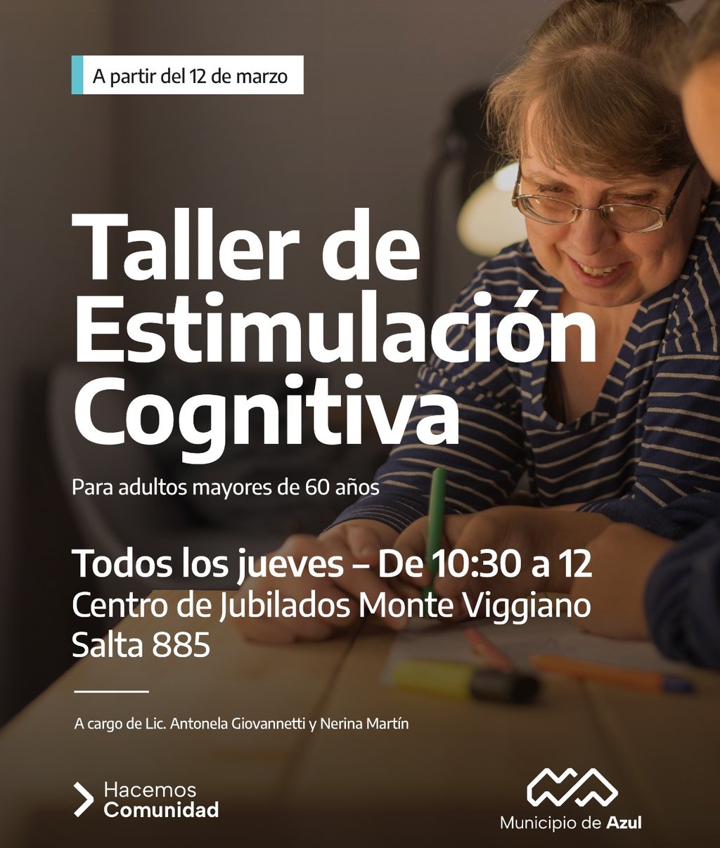 El Municipio de Azul informa que el jueves 12 de marzo comenzará a desarrollarse un taller de estimulación cognitiva.