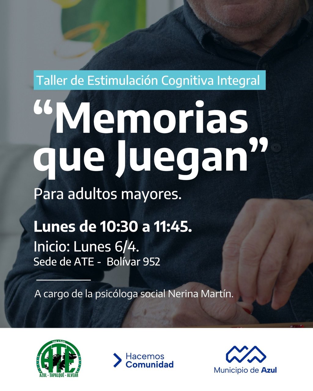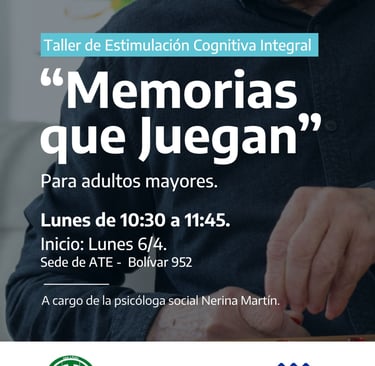 El Municipio de Azul informa que, desde abril, se motorizará un Taller de Estimulación Cognitiva Integral en la sede de la Asociación de Trabajadores del Estado (ATE) -Bolívar 952-. Se trata de un ciclo de encuentros compartidos dirigido a adultos mayores.