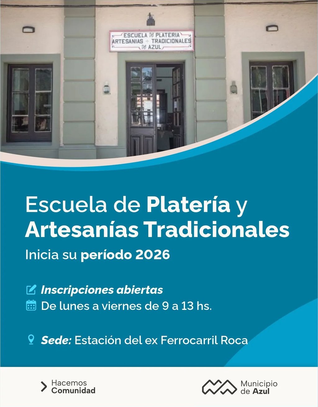 El Municipio de Azul informa que se encuentra abierta la inscripción para los siguientes talleres de la Escuela Municipal de Platería y Artesanías Tradicionales: Politextil (estampado en plástico), Talla en madera, Marroquinería, Telar María, Hilado de lana con rueca, Filigrana artesanal con cartulina, Tango social y Taller de Biotextil (estampado con fibras naturales).