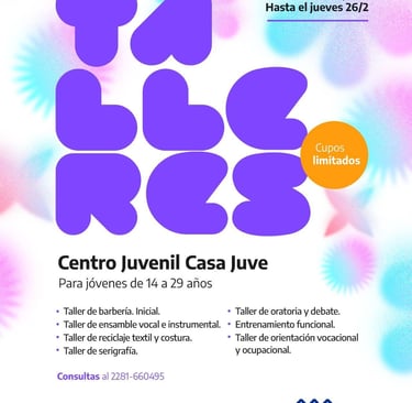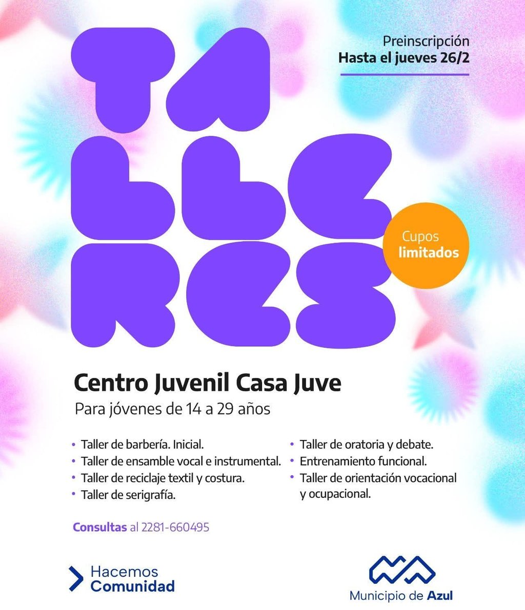 El Municipio de Azul informa que el Centro Juvenil “Casa Juve” -dependiente de la Dirección de Políticas Juveniles- abrió la preinscripción a sus talleres destinados a jóvenes de 14 a 29 años.