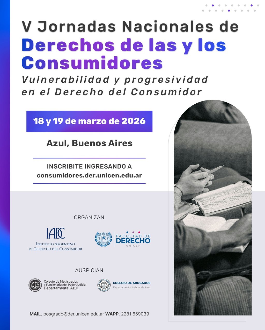 La Facultad de Derecho UNICEN invita a participar de las V Jornadas Nacionales de Derechos de las y los Consumidores, un importante encuentro académico que se realizará los días 18 y 19 de marzo de 2026 en el Colegio de Abogados de Azul, Av. Perón 514.