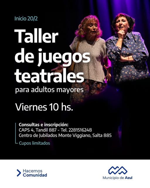 El Municipio de Azul informa que durante este año se dará continuidad al taller de juegos teatrales para adultos mayores en el Centro de Jubilados Monte Viggiano, ubicado en Salta 885.